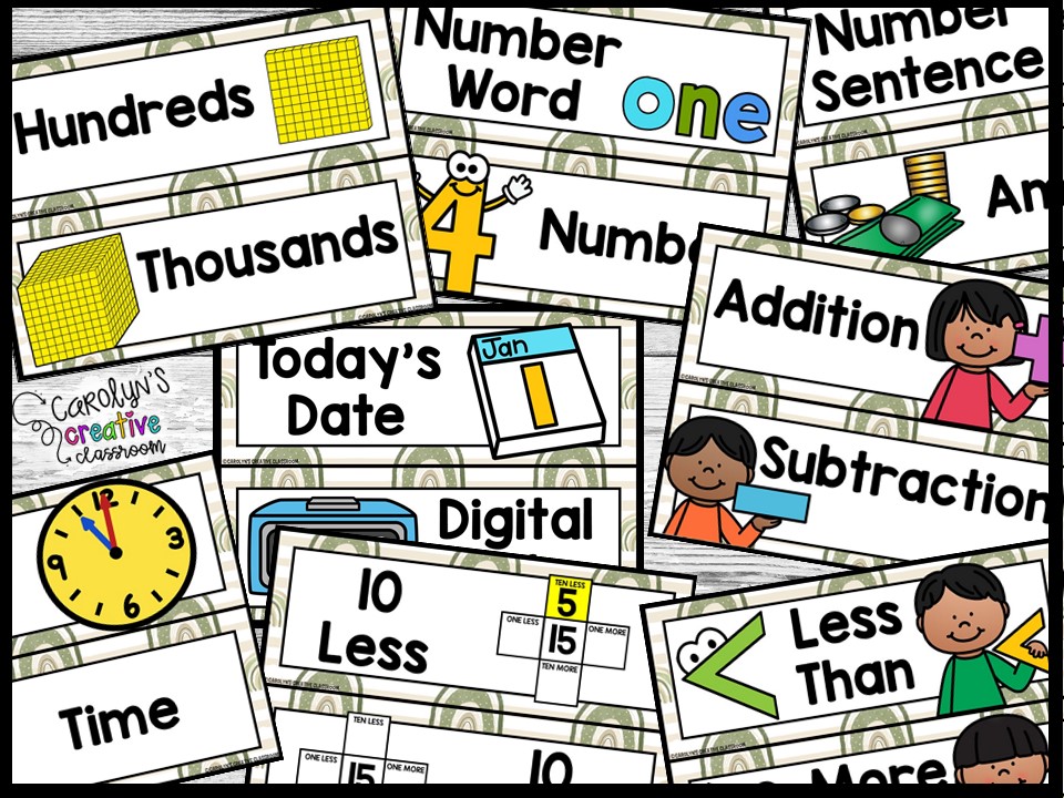 - Posters – Clock (kids can draw the hands), Ten less/ten more/1less/1 more, Word Families, Place Value, Piggy Bank, Number Line (to 5, 10, 20, 30), Hundreds Chart