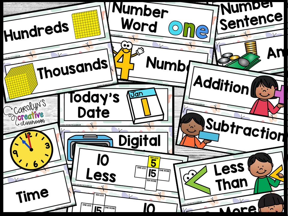 - Posters – Clock (kids can draw the hands), Ten less/ten more/1less/1 more, Word Families, Place Value, Piggy Bank, Number Line (to 5, 10, 20, 30), Hundreds Chart