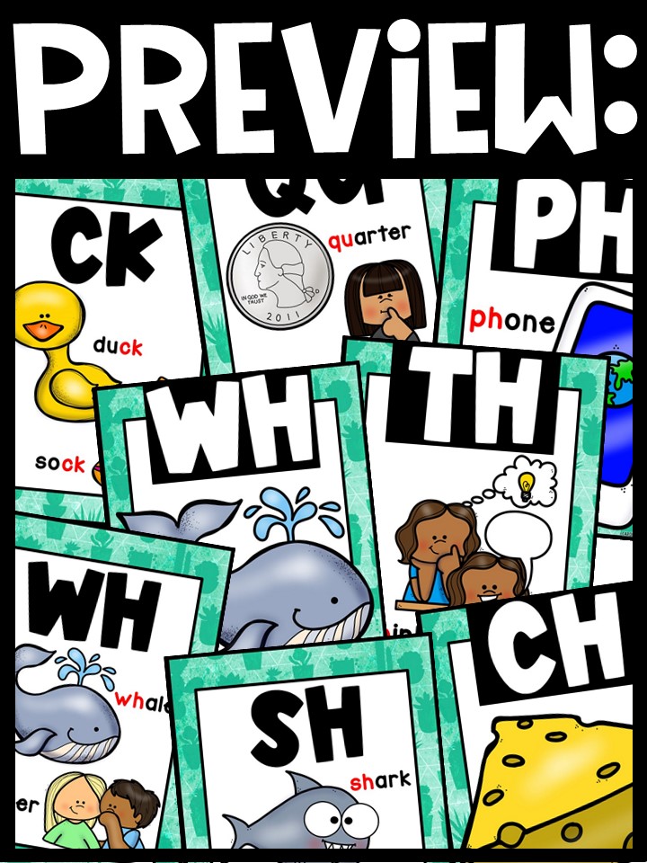 - Hang the cards to in your classroom as a decoration/reference to display the digraphs on a sound wall/