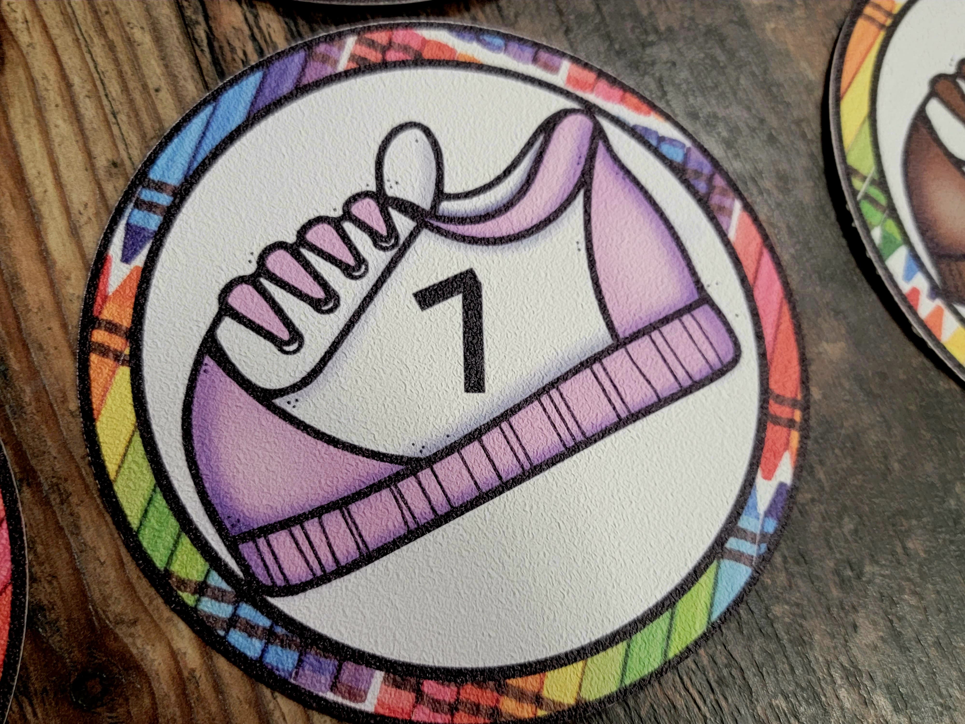 - Shoe Colors: 1-red, 2- orange, 3- yellow, 4-green, 5-blue, 6 purple, 7-pink, 8 brown, 9-black, 10 gray (Repeats colors for 11-20, 21-30)
