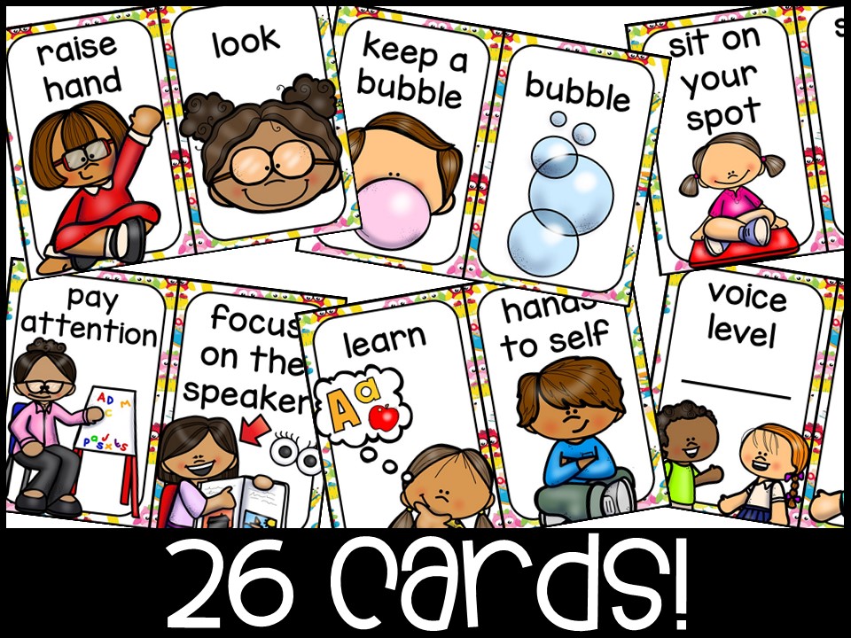 - Rule Cards (Pg 15-27) (In full color) At the beginning of the year, I teach what my carpet/circle time expectations are (what it sounds and looks like). These are developmentally appropriate rules with clip art pictures!