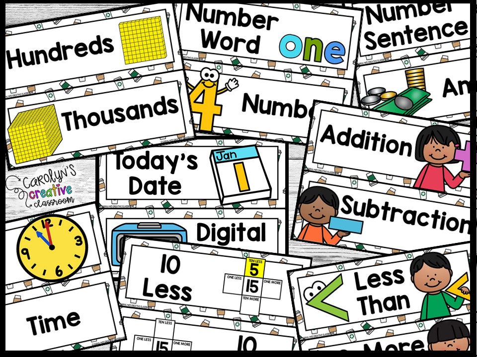 - Posters – Clock (kids can draw the hands), Ten less/ten more/1less/1 more, Word Families, Place Value, Piggy Bank, Number Line (to 5, 10, 20, 30), Hundreds Chart
