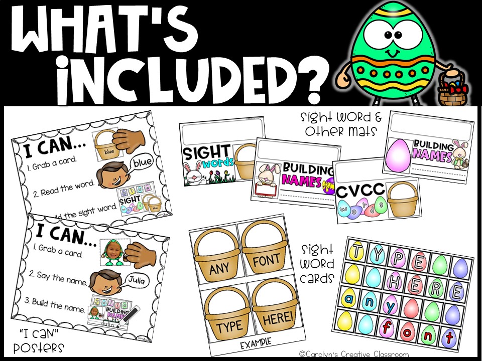 Are you looking for a small group activity to review sight words, CVC/CVCE/CCVC/CVCC, Spelling words, or name practice? Need hands-on literacy center to practice sight words that match your list? Planning Aprils’s Literacy Centers? Have an Easter theme? Look no further!