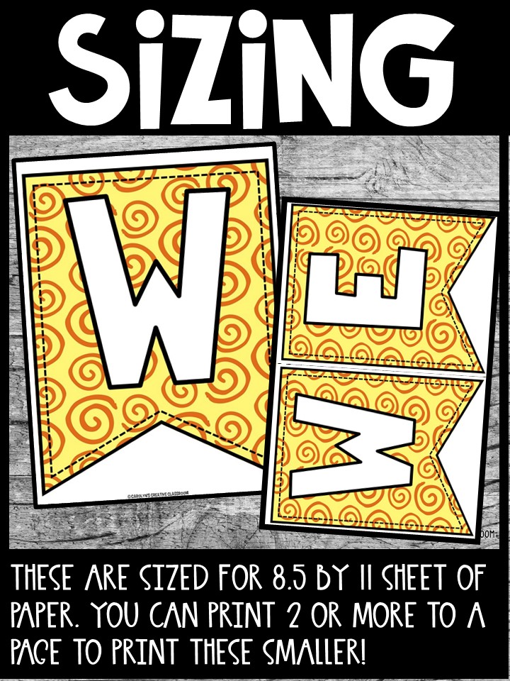 - Place these adorable banners around your room to accent and label places like your calendar, word wall, etc. Place your name on your desk hanging by using your name. Place a “welcome” sign over your door to welcome the students. Print them smaller and use on bulletin boards for the titles. There are so MANY uses for these banners!