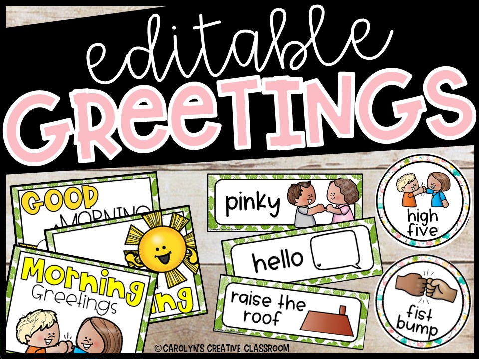 - Start your day off right! Post these greeting signs near or on your door and use them to welcome your students. Students can point to which greeting they would like as they enter the classroom! For your students who have sensory processing or during cold and flu season use the MANY options with no touching!