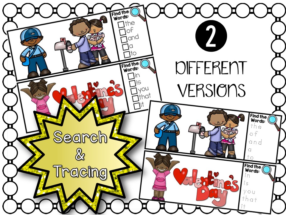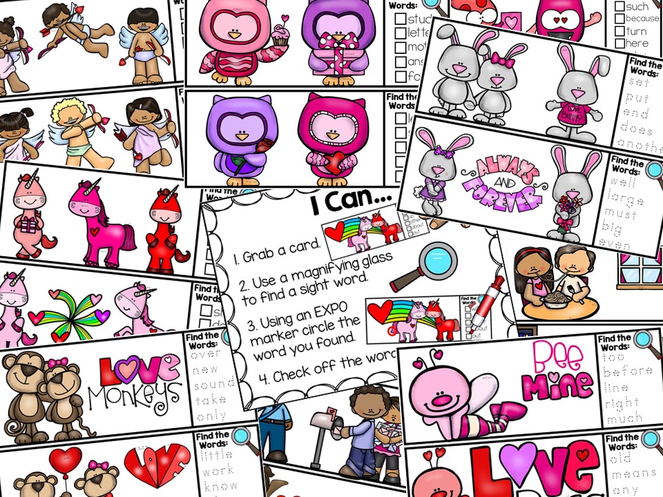 There are 40 cards with Valentine’s Day themed pictures. Hidden in the pictures are small Fry Sight Words. The students will use magnifying glasses to “spy” the words. They will use expo markers to circle them and then check off the ones they find. In the 2nd version, the student will circle the Fry words and then trace them on the card. Once they found all on the card, they erase their marks and circles. This center can be used again and again!