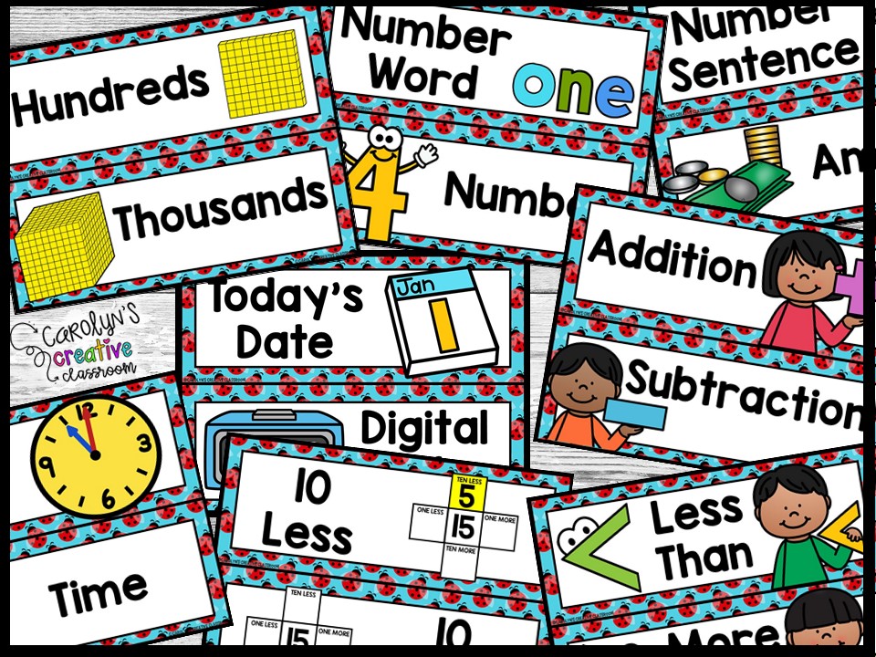 - Posters – Clock (kids can draw the hands), Ten less/ten more/1less/1 more, Word Families, Place Value, Piggy Bank, Number Line (to 5, 10, 20, 30), Hundreds Chart