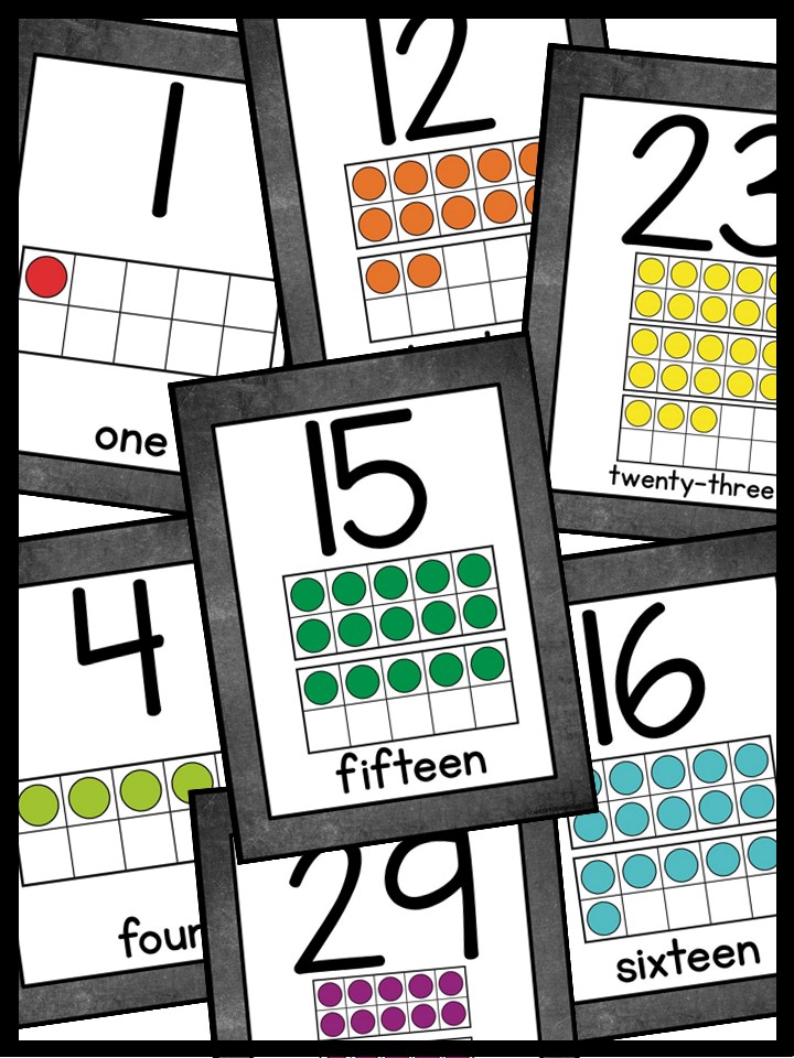 - Each Poster includes number, number word, and ten frames in rainbow colors.