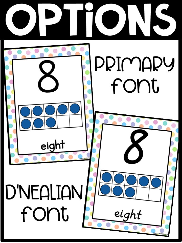 - Each Poster includes number, number word, and ten frames in rainbow colors.