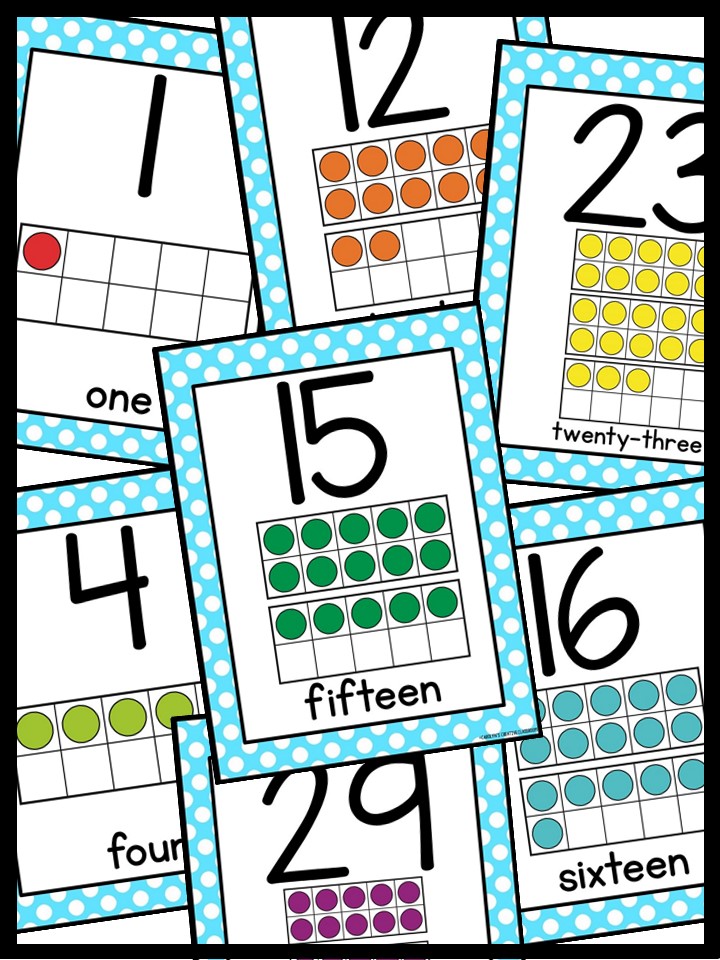 - Each Poster includes number, number word, and ten frames in rainbow colors.
