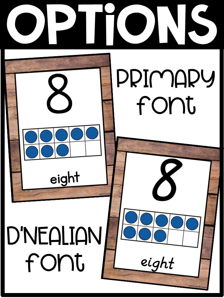 - Each Poster includes number, number word, and ten frames in rainbow colors.