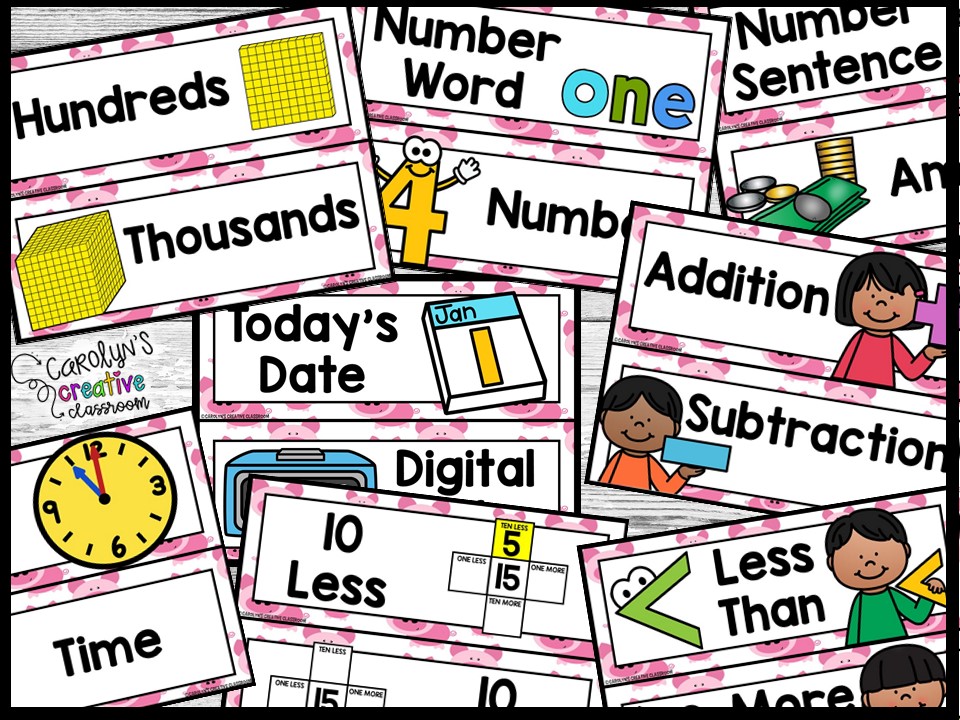 - Posters – Clock (kids can draw the hands), Ten less/ten more/1less/1 more, Word Families, Place Value, Piggy Bank, Number Line (to 5, 10, 20, 30), Hundreds Chart
