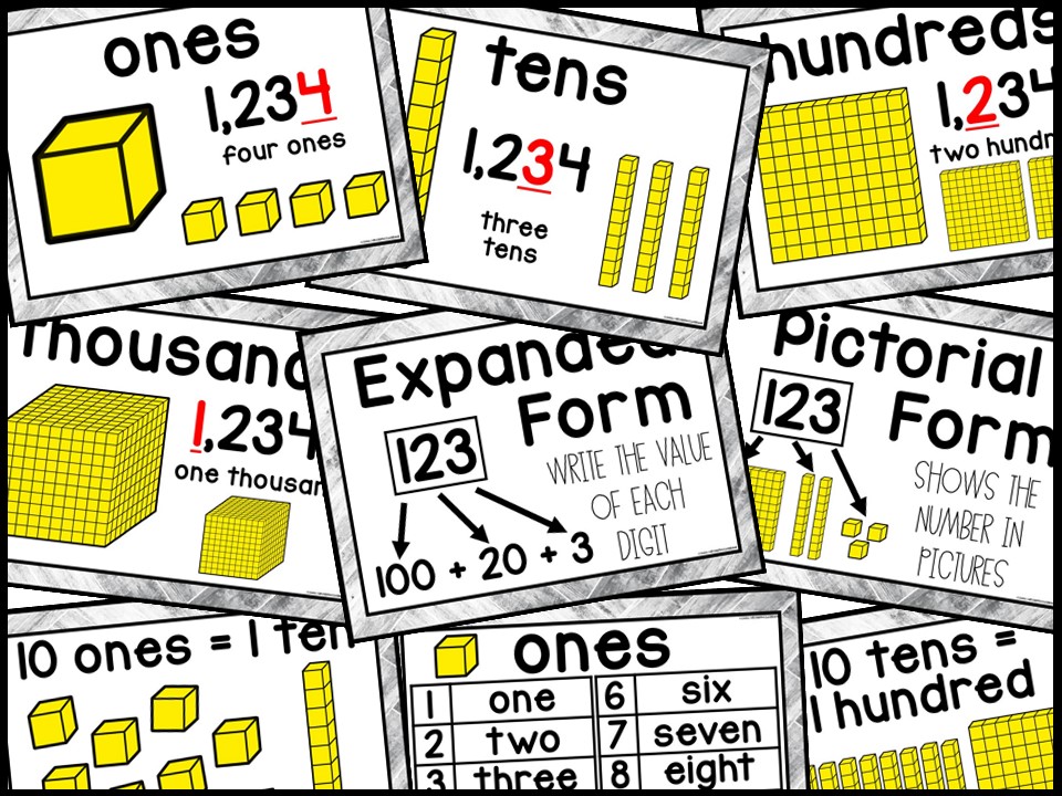 Use these place value posters to teach base ten block recognition and place value in a fun and engaging way. You can use the place value posters and cards during small group, whole group, circle/rug time, and center time.