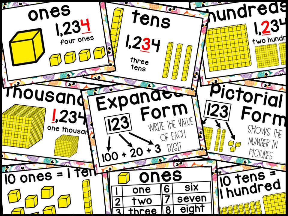 Use these place value posters to teach base ten block recognition and place value in a fun and engaging way. You can use the place value posters and cards during small group, whole group, circle/rug time, and center time.