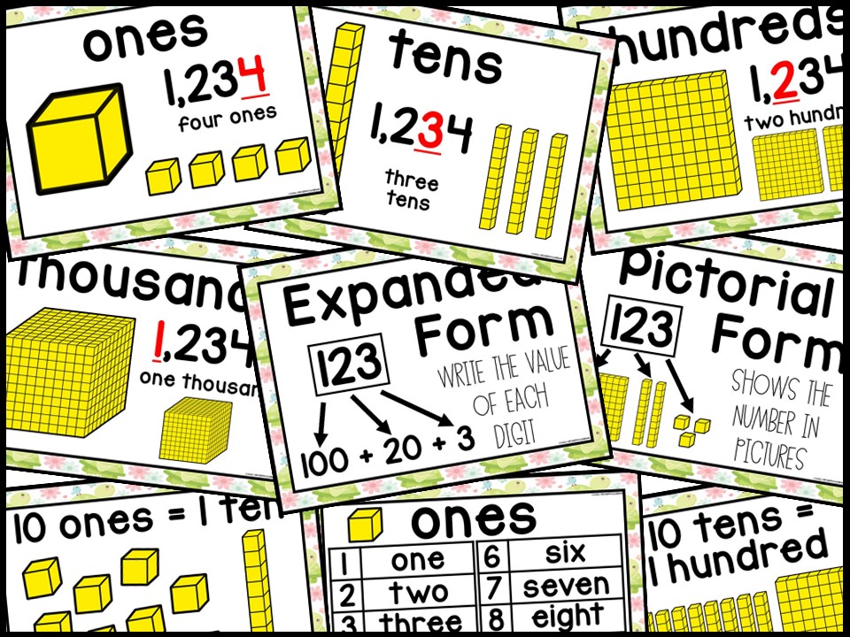 - These posters show the base ten example, number, value in word form and base ten blocks