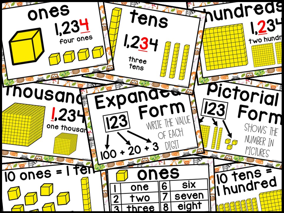 Use these place value posters to teach base ten block recognition and place value in a fun and engaging way. You can use the place value posters and cards during small group, whole group, circle/rug time, and center time.