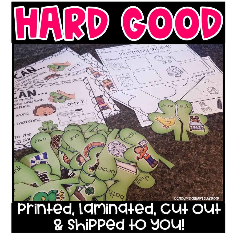 - Printed, laminated and cut out 20 rhyming shamrock puzzles, 5 I can posters, and 6 recording sheets (9 sheets of paper).