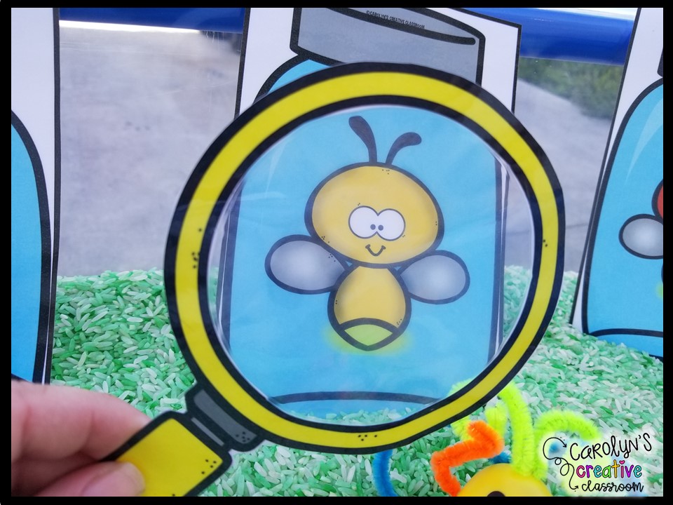 - Literacy Center – Students can play in the sensory bin matching colors. Or they can sort the bugs in the sensory bin by different rules.