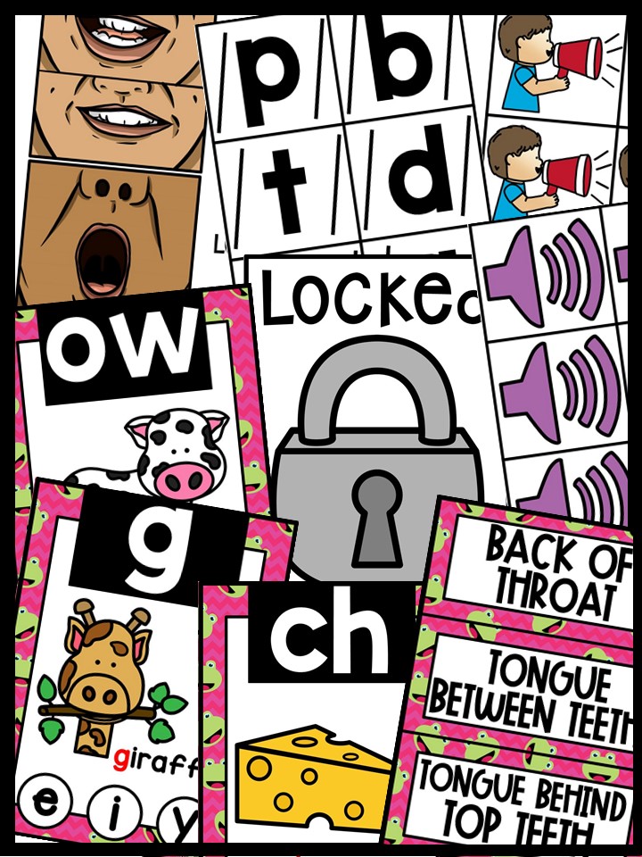 - 4 Locked Posters (Cover your sound wall. As you teach the phoneme uncover the cards beneath) 4 different versions. Comes in Color and B/W.
