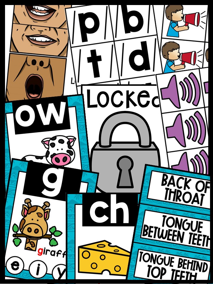 - 4 Locked Posters (Cover your sound wall. As you teach the phoneme uncover the cards beneath) 4 different versions. Comes in Color and B/W.