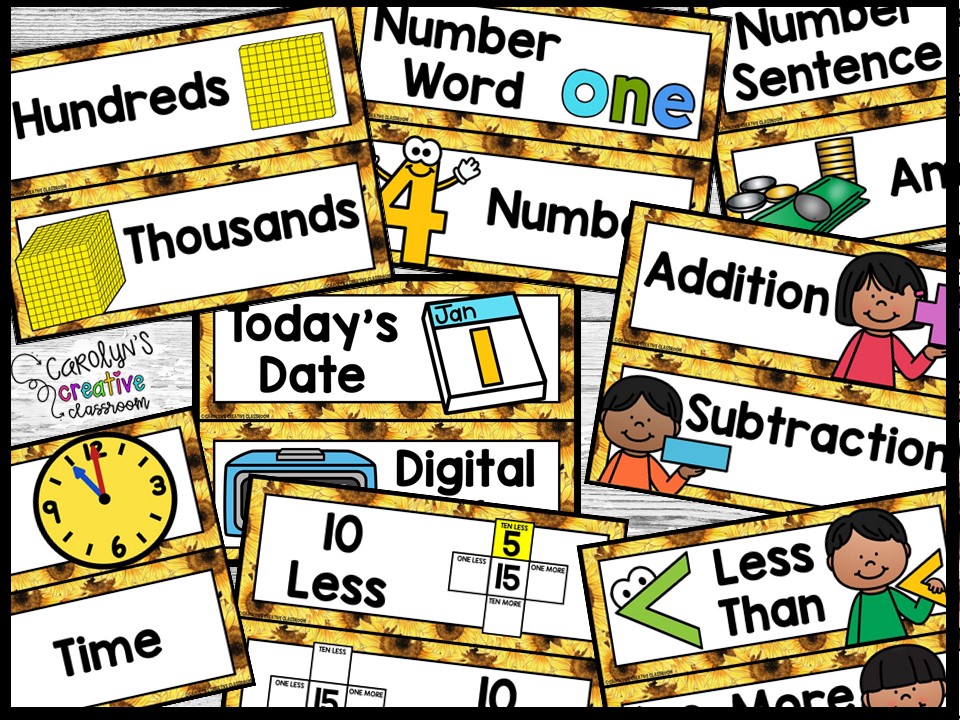 - Posters – Clock (kids can draw the hands), Ten less/ten more/1less/1 more, Word Families, Place Value, Piggy Bank, Number Line (to 5, 10, 20, 30), Hundreds Chart