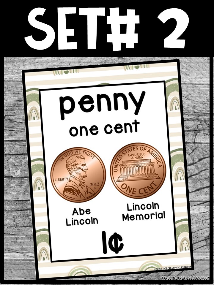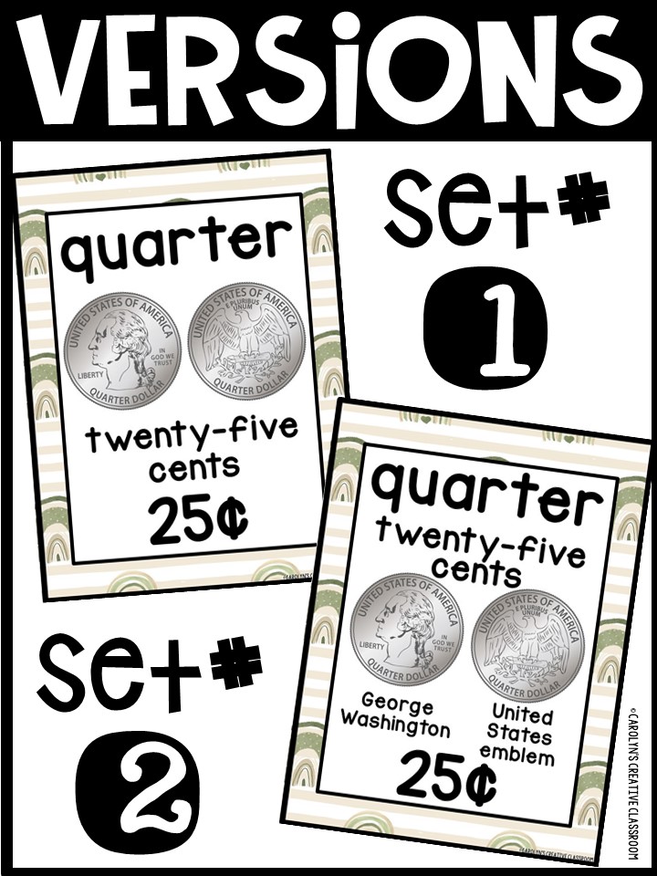 - Each Poster includes coin name, coin picture, value in both word and print. Dollar bills only have front side shown.