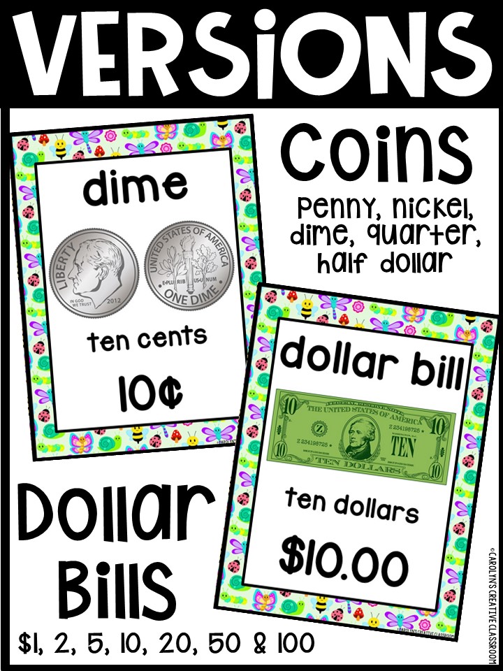 - Each Poster includes coin name, coin picture, value in both word and print. Dollar bills only have front side shown.