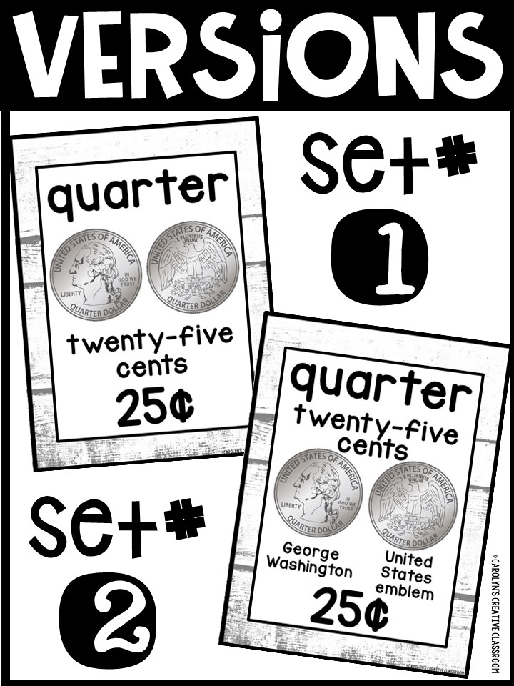 - Each Poster includes coin name, coin picture, value in both word and print. Dollar bills only have front side shown.