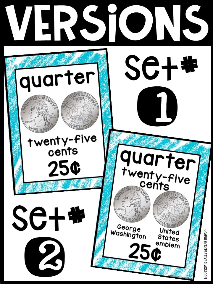 - Each Poster includes coin name, coin picture, value in both word and print. Dollar bills only have front side shown.