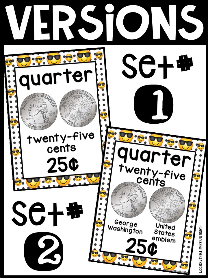 - Each Poster includes coin name, coin picture, value in both word and print. Dollar bills only have front side shown.