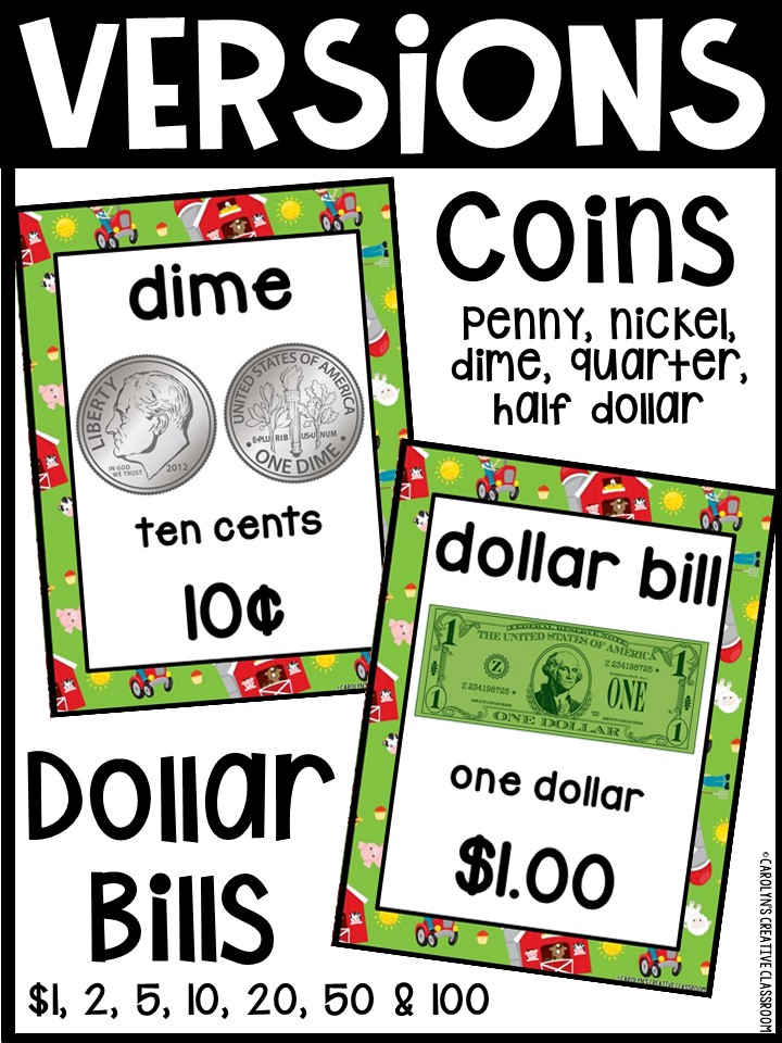 Use these money posters to teach coin and dollar bill recognition in a fun and engaging way. You can use the money posters and cards during small group, whole group, circle/rug time, and center time.