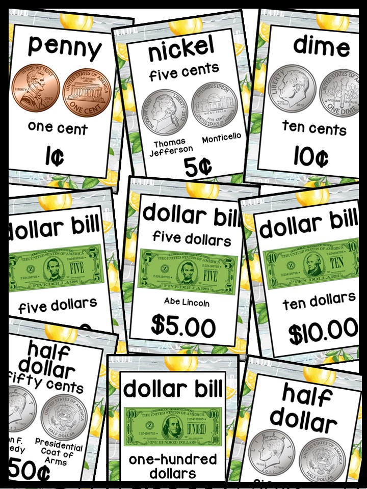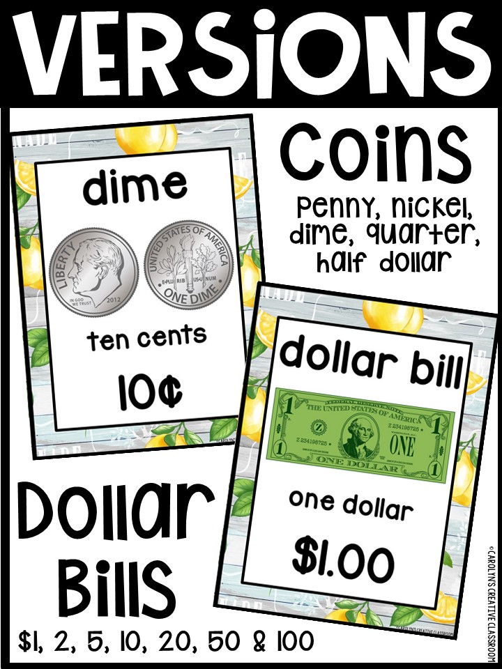 - Each Poster includes coin name, coin picture, value in both word and print. Dollar bills only have front side shown.
