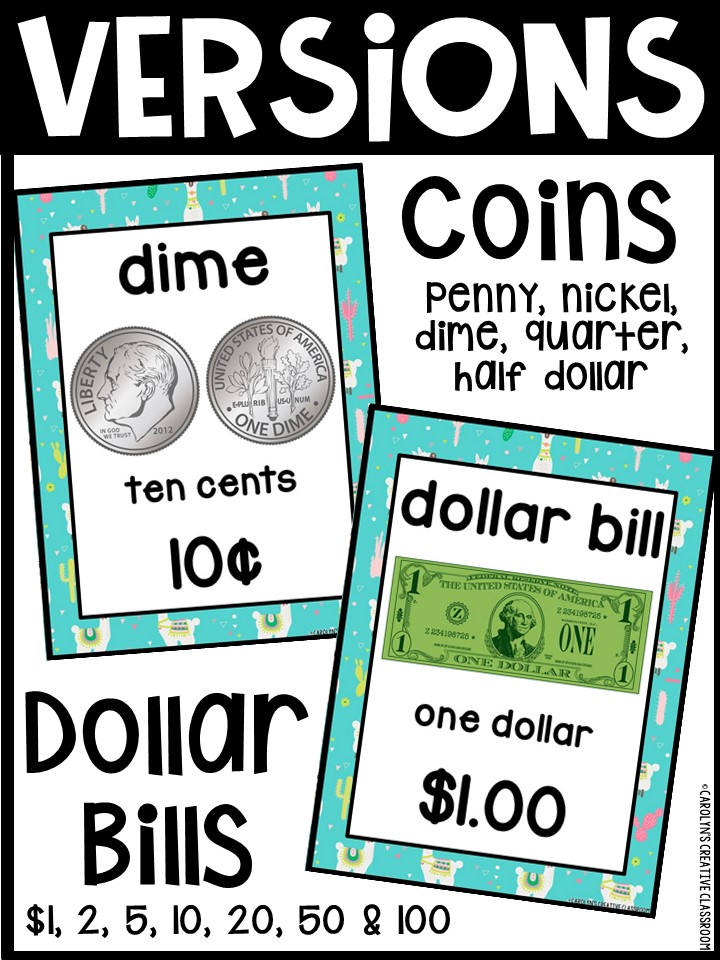 - Each Poster includes coin name, coin picture, value in both word and print. Dollar bills only have front side shown.
