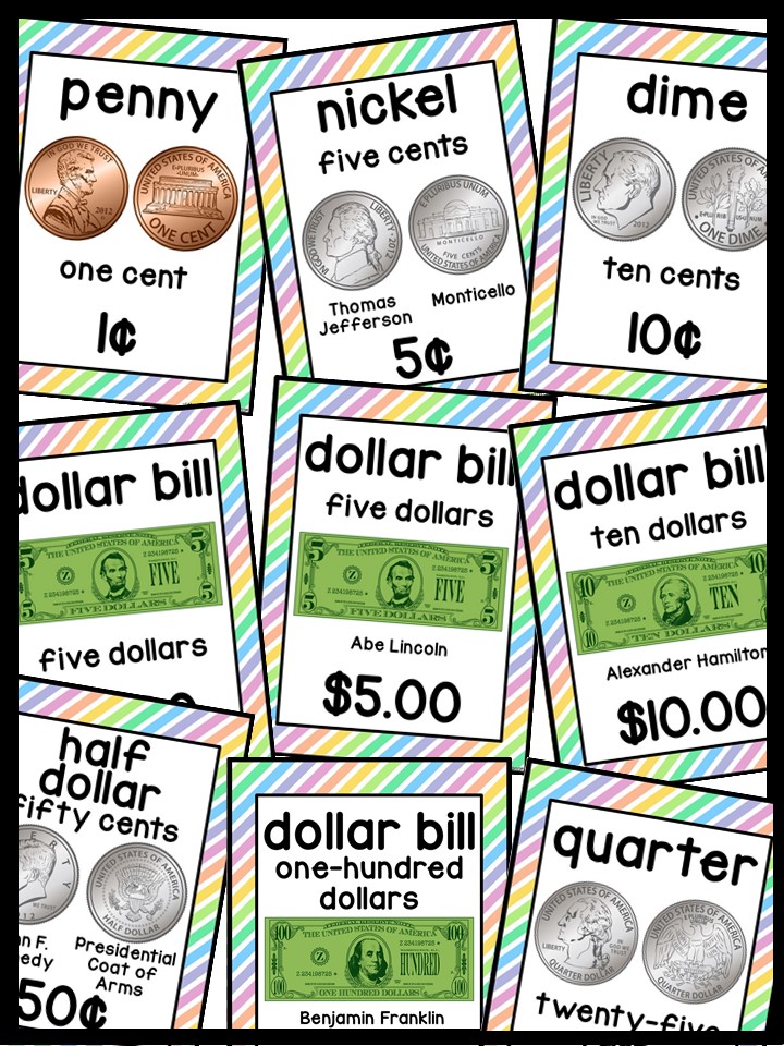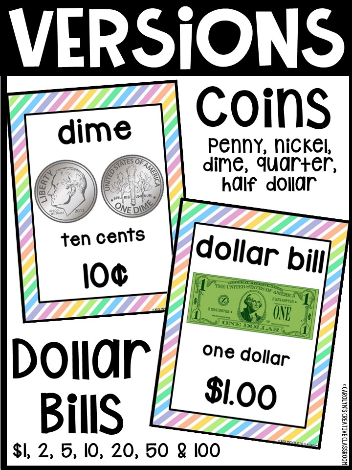 Use these money posters to teach coin and dollar bill recognition in a fun and engaging way. You can use the money posters and cards during small group, whole group, circle/rug time, and center time.