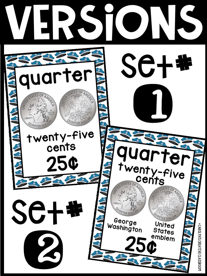 - Each Poster includes coin name, coin picture, value in both word and print. Dollar bills only have front side shown.