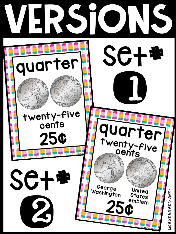 There are 2 different versions included in this set. There is a simple version and set# 2 describes what is on the front and back of the coins & presidents on the dollar bills.