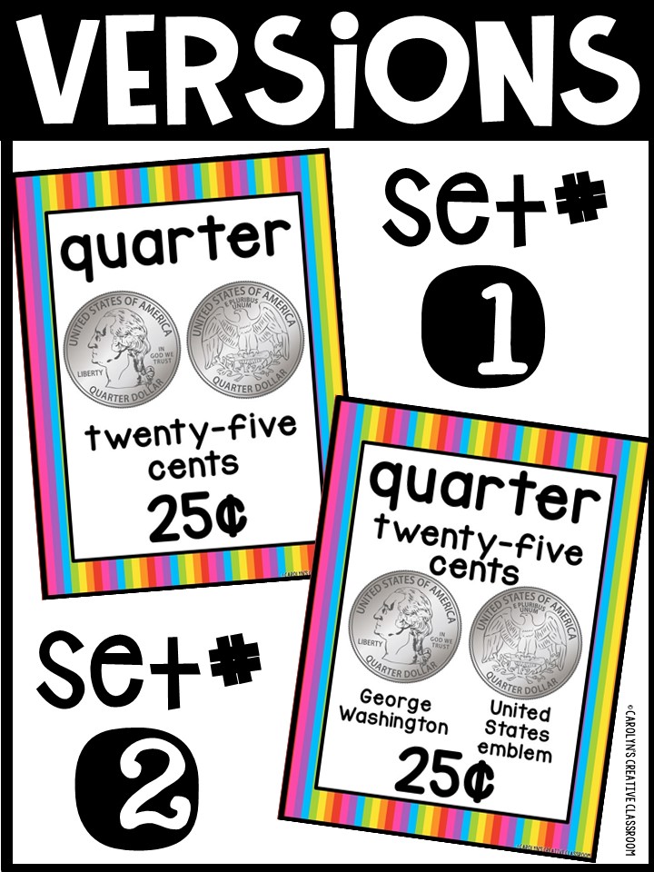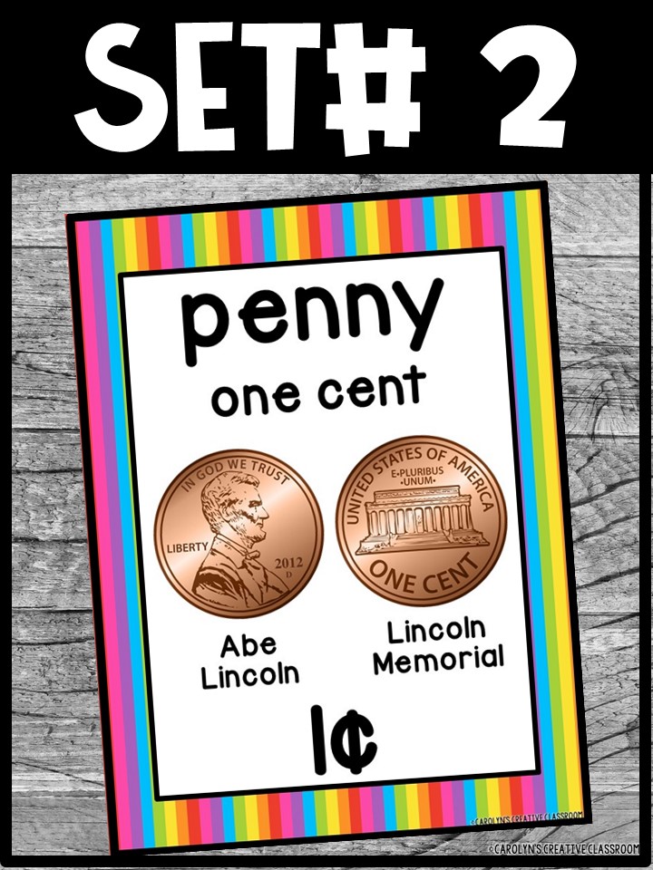 - Each Poster includes coin name, coin picture, value in both word and print. Dollar bills only have front side shown.