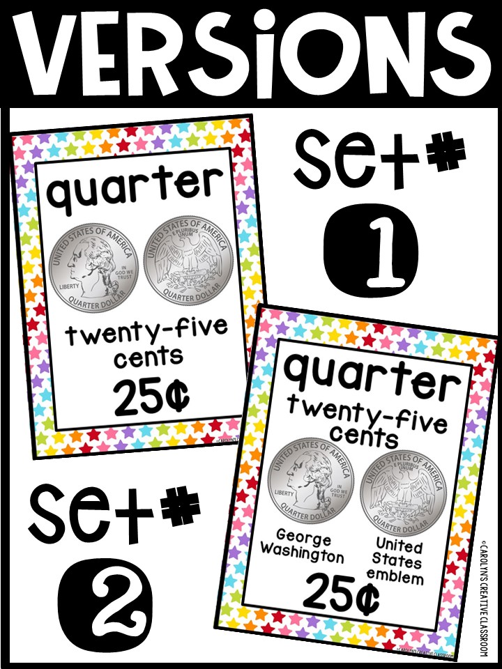 - Each Poster includes coin name, coin picture, value in both word and print. Dollar bills only have front side shown.