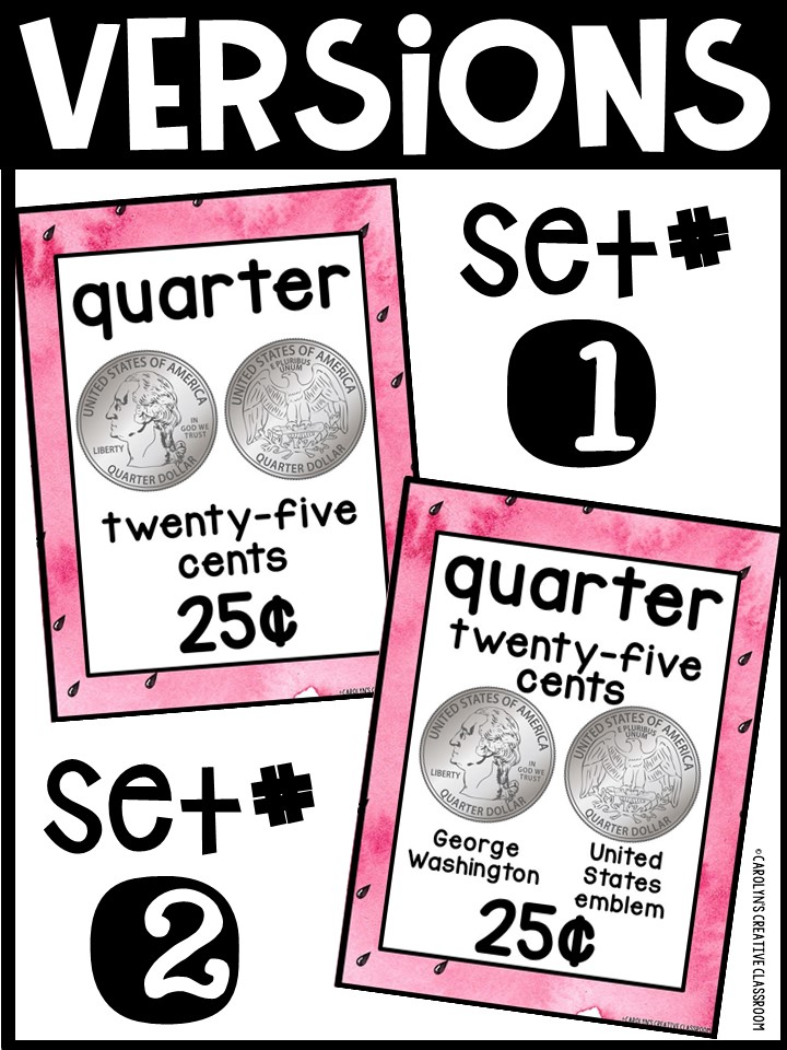 - Each Poster includes coin name, coin picture, value in both word and print. Dollar bills only have front side shown.