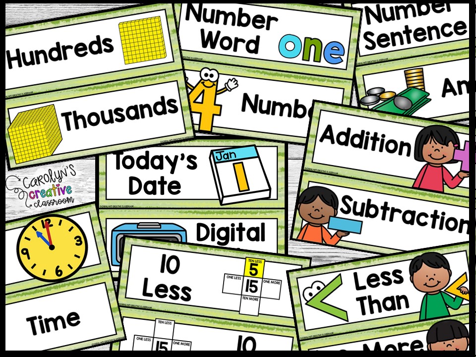 - Posters – Clock (kids can draw the hands), Ten less/ten more/1less/1 more, Word Families, Place Value, Piggy Bank, Number Line (to 5, 10, 20, 30), Hundreds Chart